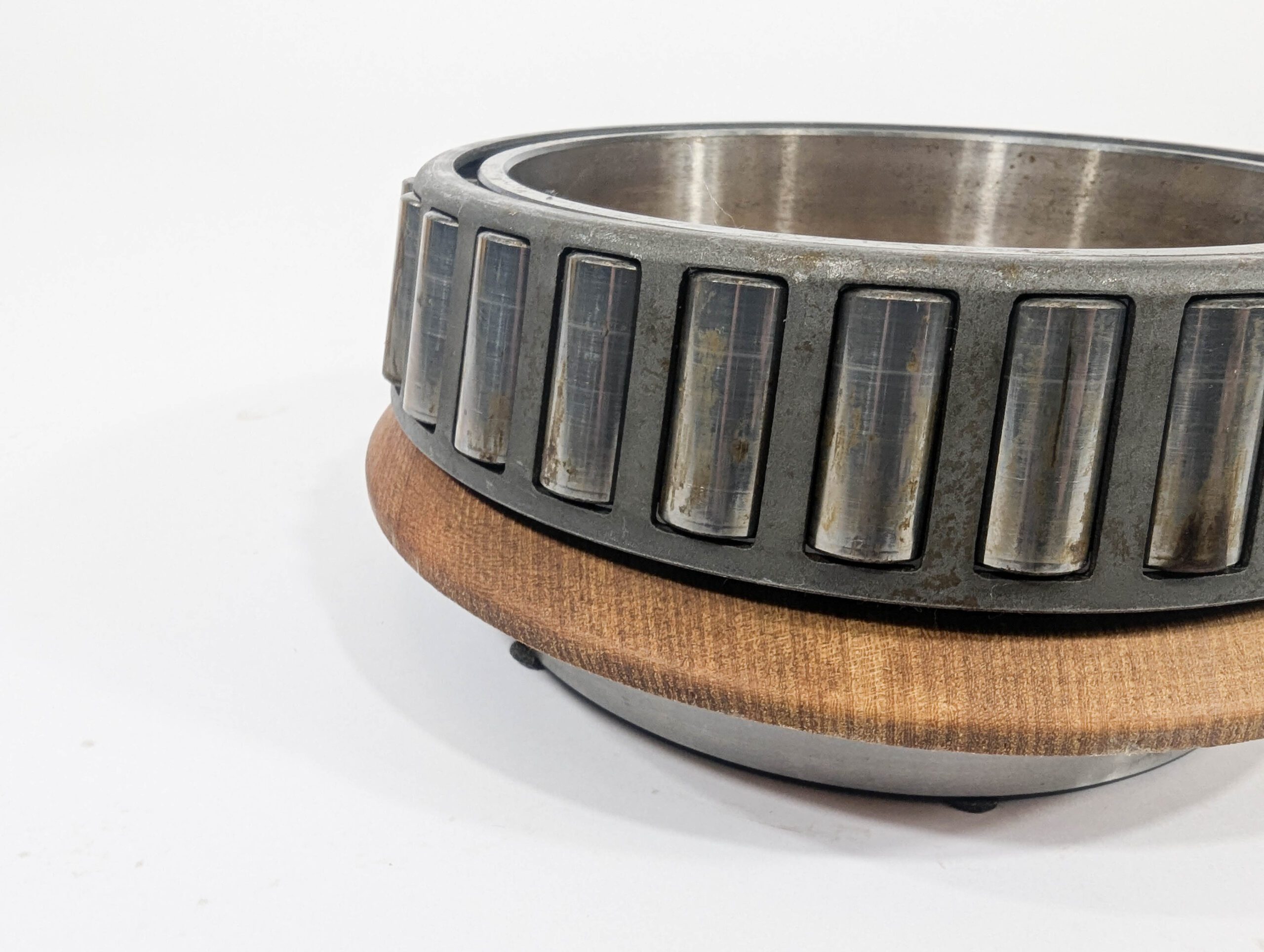 Crafted from an original decommissioned Airbus A330 wheel bearing, this distinctive bowl carries the spirit of aviation engineering into everyday design. The bearing has been carefully split, with its inner ring forming the upper section. A hand‑turned elm base completes the piece, adding natural warmth to the industrial form.