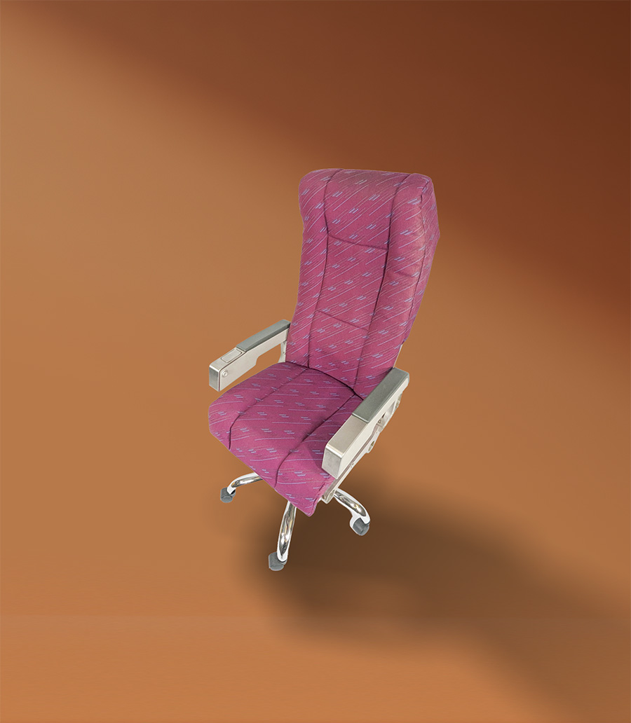 Once reserved for the inner circle of Formula 1, this chair carries with it the glamour and exclusivity of private aviation. Originally passenger seating aboard a BAE146 aircraft — a jet privately operated for F1 and famously associated with Bernie Ecclestone — it has been carefully reconfigured and mounted onto an adjustable office wheel base.