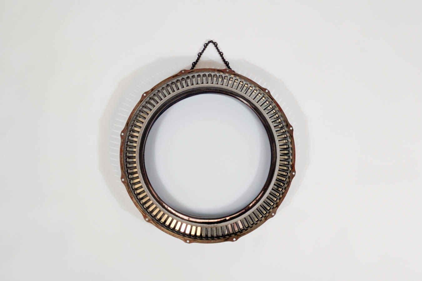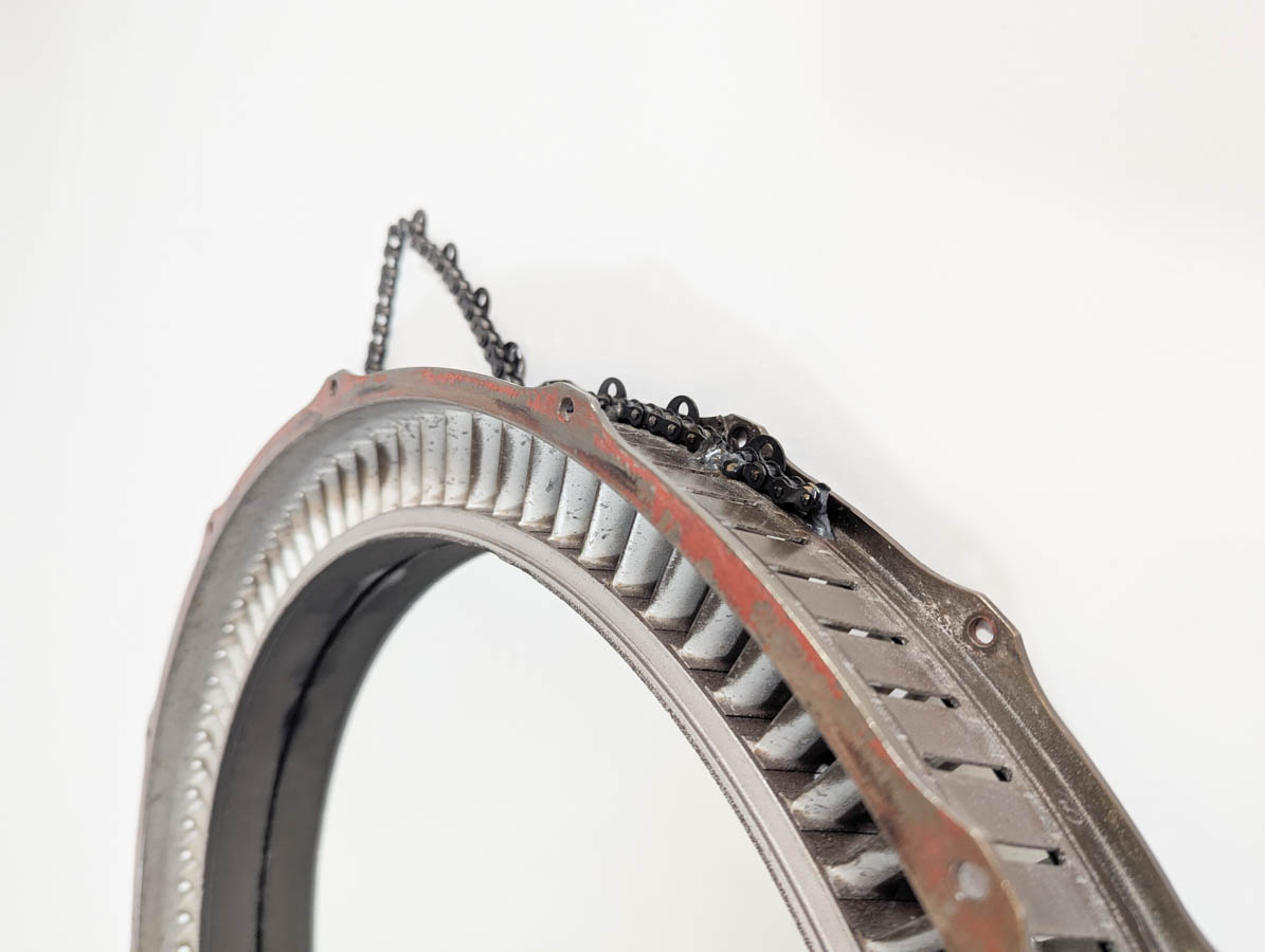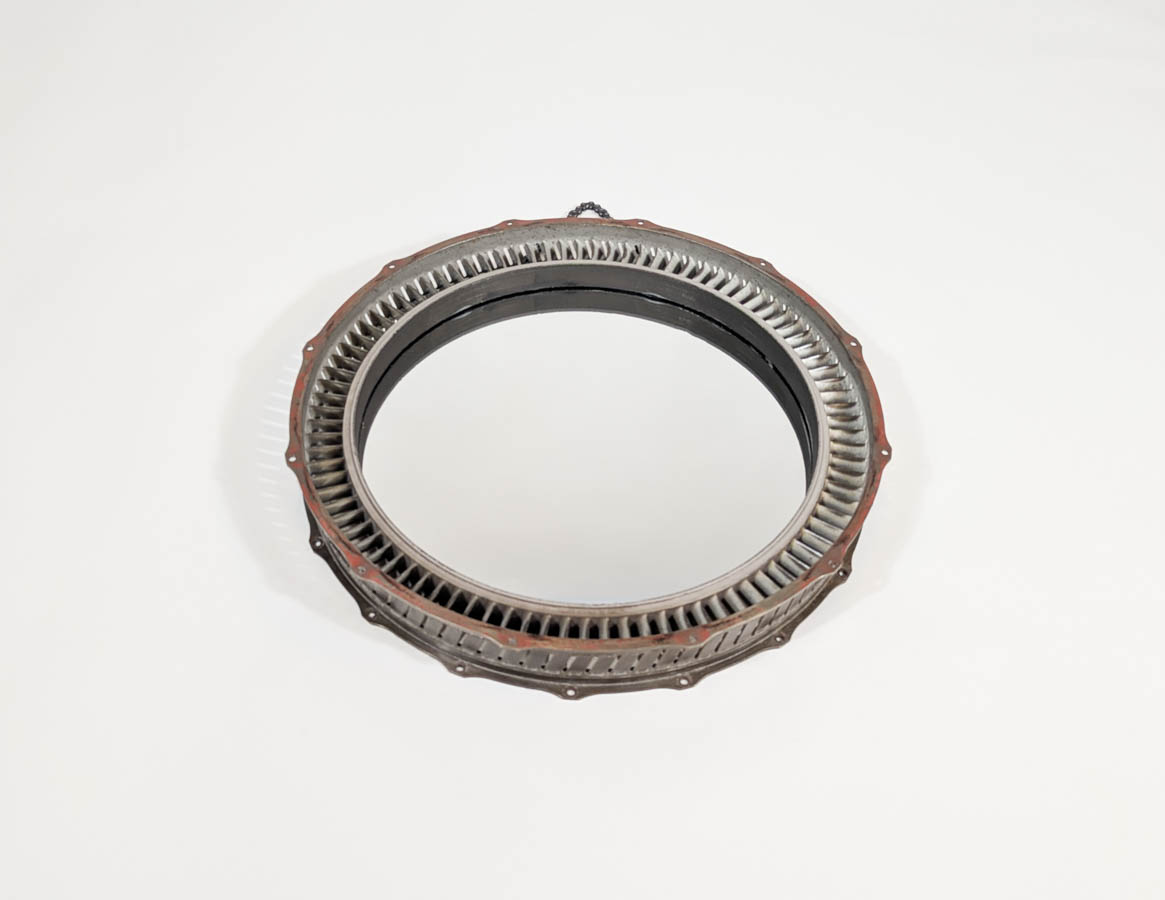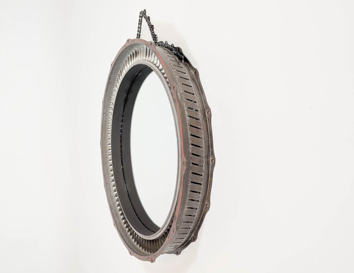 This distinctive mirror is formed from a Stage 4 vane ring, salvaged from a Rolls-Royce Adour jet engine—crafted for the Hawk aircraft and famously flown by the RAF’s Red Arrows. Originally designed for flight, the ring was marked with red paint by Rolls-Royce after testing revealed it unsuitable for service—a rare and symbolic trace of its journey through British aviation.